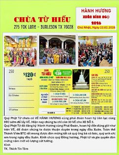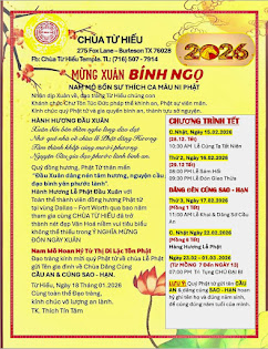 CHÙA TỪ HIẾU – BURLESON, TEXAS Nam Mô Bổn Sư Thích Ca Mâu Ni Phật. Kính mời quý đồng hương và Phật tử tham dự các hoạt động tâm linh ý nghĩa đầu Xuân 2026. 🕒 Thời gian: Chủ Nhật, 22/02/2026 (Mùng 6 Tết) 💰 Giá vé: $120 / người (Bao gồm xe & 3 bữa ăn chay) ⚠️ HIỆN CHỈ CÒN 30 VÉ CHO XE SỐ 3 – QUÝ PHẬT TỬ ĐĂNG KÝ NGAY!Chương Trình Mừng Xuân Bính Ngọ 2026