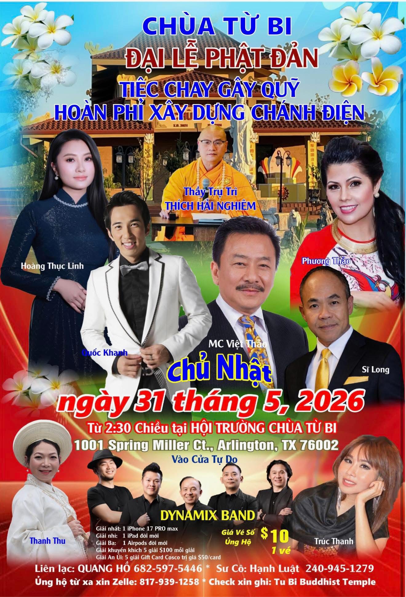Kính mời quý đồng hương và quý Phật tử đến tham dự chương trình văn nghệ đặc biệt và tiệc chay gây quỹ để cùng chung tay hoàn thiện ngôi Chánh Điện của Chùa Từ Bi.