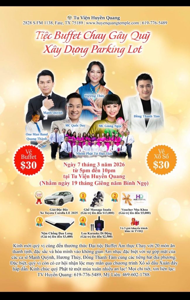 Tu Viện Huyền Quang trân trọng kính mời quý đồng hương, Phật tử xa gần về tham dự chương trình nhạc hội và ẩm thực đặc biệt nhằm chung tay trợ duyên cho Phật sự xây dựng tu viện ngày một khang trang.